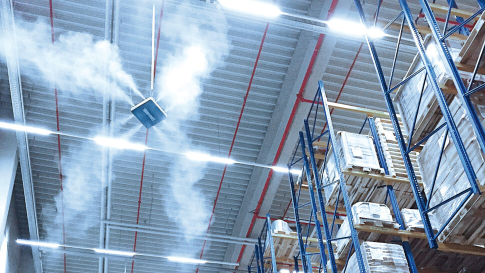 Direkt-Raumluftbefeuchter versprühen mikrofeine Wassertröpfchen und erzeugen dadurch die Verdunstungskühlung.