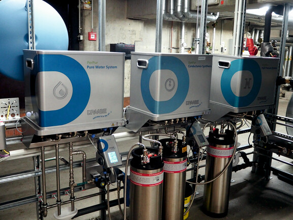 Eine hygienische und sichere Luftbefeuchtung ist eine wesentliche Voraussetzung für den Flughafenbetrieb. Die Qualität und Hygiene der Direktraum-Luftbefeuchtung wird durch eine mehrstufige Wasseraufbereitung gewährleistet, die aus einem Enthärter, Filterstufen, einer zentralen Umkehrosmose und einer zusätzlichen UV-C-Desinfektion besteht. Regelmäßige Kontrollen, Desinfektionen und der Austausch stark beanspruchter Systemkomponenten sind notwendig, um eine Kontamination der wasserführenden Elemente zu verhindern. Sowohl die systemeigene Wasseraufbereitung als auch die Hochdruckpumpe des Systems sind in tragbaren Kleincontainern untergebracht, die zu Wartungszwecken ausgetauscht werden. Im Rahmen eines automatisierten Wartungsplans erhält der Flughafen Nürnberg alle sechs Monate vollständig gewartete und desinfizierte Ersatzgeräte, die außerhalb des Sicherheitsbereichs in einem Technikzentrum installiert und leicht zugänglich sind. „Neben der hochwertigen adiabatischen Hochdrucktechnologie ist dieser Containeraustausch eines der Alleinstellungsmerkmale von Condair. Für uns bedeutet dieser Service hohe Sicherheit, einfache Handhabung und geringen Aufwand“, erklärt Thomas Harrer. Dass das System auch während des Betriebs hygienisch funktioniert und dem neuesten Stand der Technik entspricht, wird einmal jährlich von VDI-zertifizierten Fachingenieuren bestätigt. Da das System nach VDI 6022 Blatt 6 zertifiziert ist, gehört diese jährliche Vor-Ort-Inspektion ebenfalls zum regelmäßigen Service des Herstellers.