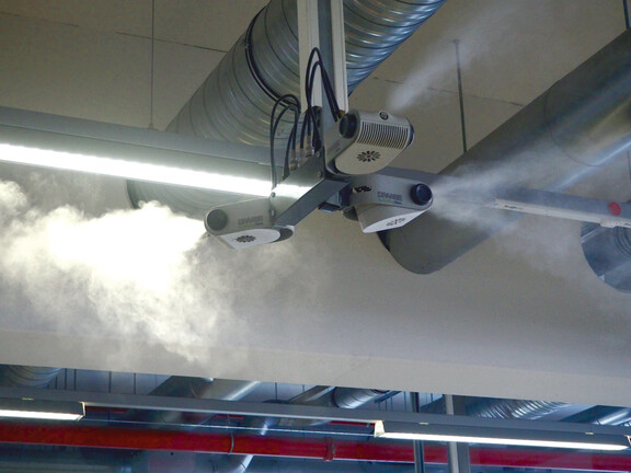 Seit 2019 sind am Sicherheitskontrollpunkt des Albrecht-Dürer-Flughafens Nürnberg 37 Condair Hochdruckdüsen-Luftbefeuchter im Einsatz. Die an der Hallendecke aufgehängten Anlagen sind einzeln über dem Check-in-Bereich und dem Gepäckband positioniert. Der mikrofeine Nebel mit einer Tröpfchengröße von weniger als 15 μm wird durch Hochdrucktechnik erzielt, die das Wasser mit einem Betriebsdruck von bis zu 85 bar durch Hochleistungsdüsen presst. Im Vergleich zu anderen Luftbefeuchtungstechnologien fällt nur ein Bruchteil der Energiekosten an. Zusätzlich sorgt die Adiabate Kühlung der Verdunstung für ein angenehmes Raumklima: 100 Liter Wasser aus der Hochdruck-Düsenbefeuchtung nehmen rund 70 kW Wärme auf, bei einem Energieverbrauch von nur 0,6 kW. Die gewünschte Mindestluftfeuchtigkeit von 40 Prozent wird durch Raumsensoren geregelt, die die Klimasituation im Sicherheitskontrollbereich kontinuierlich überwachen und für ein gleichbleibend konstantes Feuchtigkeitsniveau sorgen. Die Hochdruckbefeuchter werden genau dann aktiviert, wenn der Sollwert nicht erreicht wird. Das neue System wurde über Modbus an das BACnet-Gebäudemanagementsystem angeschlossen, sodass alle Betriebsbedingungen jederzeit überwacht und die Luftfeuchtigkeitswerte aufgezeichnet werden können.