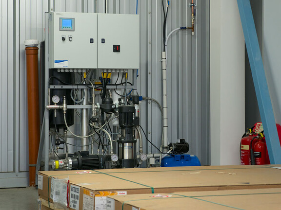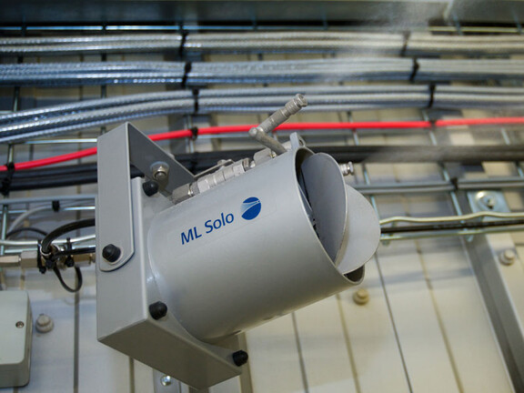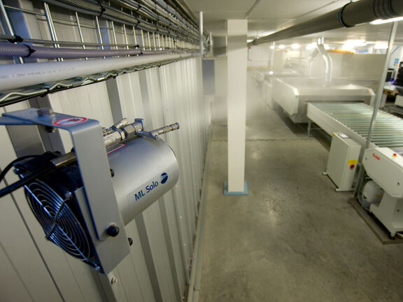 Im Plattenherstellungsbereich befinden sich zehn Sprühköpfe, die pro Stunde bis zu 48 Liter reines, entmineralisiertes Wasser in die Luft abgeben können. Eine effektive Feuchtigkeitsverteilung wird durch die Doppelstrahldüsen an jedem ML Solo-Gerät und einen energiesparenden, geräuscharmen Ventilator gewährleistet. Die Düsen arbeiten absolut sicher bei 70 bar und werden mit mineralfreiem Wasser versorgt, das zentral von einer Condair MLPRO100-Pumpe und einer Umkehrosmose-Aufbereitungsanlage erzeugt wird. Das System verfügt über eine ölfreie Hochdruckpumpe aus Edelstahl, eine RO-Wasseraufbereitung und eine UV-Wassersterilisation, sodass ein geringer Wartungsaufwand und reine, hygienische Sprühnebel garantiert sind. Die Rohrleitungen bestehen aus Edelstahl und hochwertigen, korrosionsfreien flexiblen Schläuchen.