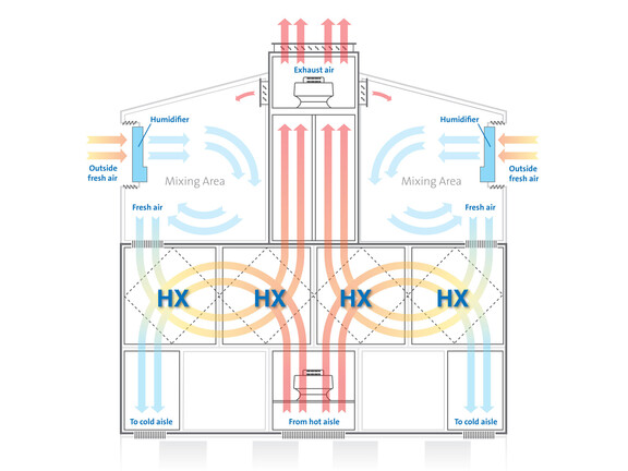 Das EDPAC-Lüftungssystem kühlt ohne Kältemaschinen, indem es zwei Luftströme erzeugt: einen internen und einen externen. Der interne Luftstrom zirkuliert die Luft zu und von den Datenhallen, während der externe Luftstrom die Außenluft ansaugt und wieder abführt. Beide Luftströme durchlaufen eine Reihe von Wärmetauschern, um die kühle Wärmeenergie vom externen zum internen Luftstrom zu übertragen, ohne dass sich die beiden Luftströme physisch vermischen.