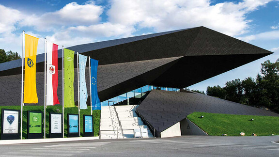 Das Festspielhaus Erl wurde von den Wiener Architekten Elke Delugan-Meissl und Roman Delugan wie ein aus dem Berg herausgeschlagener Diamant entworfen. Die Geometrie des Gebäudes nimmt auch Bezug auf die dahinter liegenden Felsformationen und die Topografie der Umgebung. Die Eingangstreppe und die Glasfassade des Foyers wurden so gestaltet, dass sie einer tektonischen Schichtung mit dazwischen liegenden Spalten ähneln.