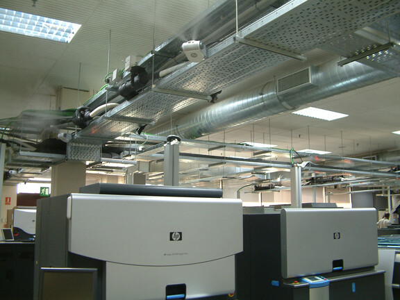 Um optimale Druck- und Produktionsergebnisse zu gewährleisten, sind im HP Demo- und Schulungszentrum konstante Luftfeuchtigkeitswerte erforderlich: „Elektrostatische Aufladungen, Veränderungen der Papiergröße und schwankende Druckqualität beeinträchtigen unsere Schulungen und Vorführungen“, erklärt Adam Goldthorp, HP Training Manager. „Darüber hinaus“, so Goldthorp, „erfordern unterschiedliche Drucktechnologien und Substrate (z. B. Kunststoff, Karton) auch unterschiedliche Luftfeuchtigkeitswerte.“ Das bestehende Dampfbefeuchtungssystem, das in die zentrale Lüftungsanlage eingebaut war, konnte diese Anforderungen nicht mehr erfüllen und wurde 2013 abgeschaltet.