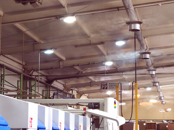 Der Verpackungsspezialist entschied sich für das ML-System von Condair Systems. Dieses System eignet sich besonders gut für Produktionshallen mit hohen Decken und großen Flächen. Insgesamt sind 23 ML Princess Hochdruck-Düsenbefeuchter installiert, die in den verschiedenen Produktionsbereichen an der Decke aufgehängt sind. Bei einem Betriebsdruck von bis zu 70 bar führt jeder ML Princess eine maximale Zerstäubung von 36 Litern Wasser pro Stunde in einem ultrafeinen Nebel durch, ohne dass teure Druckluft, Dampf oder Ultraschall erforderlich sind. Die direkte Hochdruckbefeuchtung bietet Bart zwei zusätzliche Vorteile in der Produktion: Die sofortige Verdunstung des Wassers in der Luft sorgt für einen Kühleffekt. Die Temperatur in den Produktionsbereichen kann ohne zusätzliche Klimatisierung um 2 °C bis 5 °C gesenkt werden. Darüber hinaus wird die Luft von Staub gereinigt. Ein dünner Wasserfilm umhüllt die Staubpartikel, wodurch sie sich schneller absetzen und nicht wieder aufgewirbelt werden können.