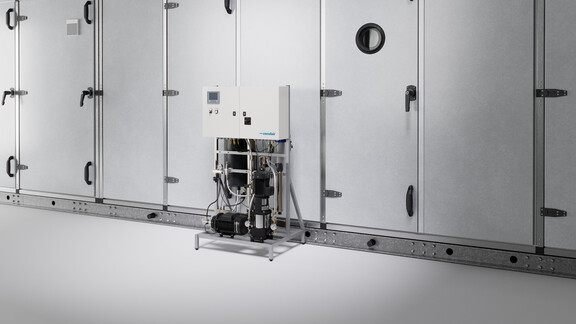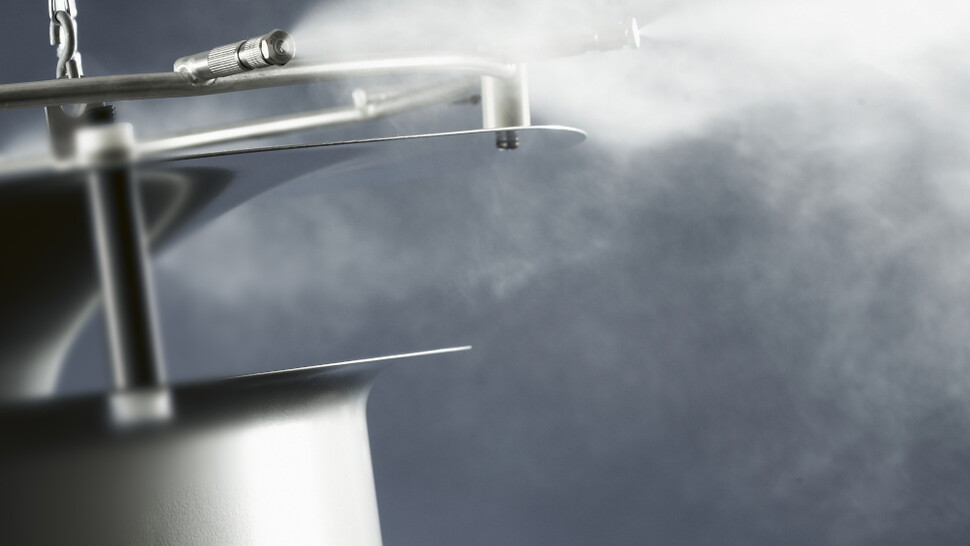 Hochdruckbefeuchter zerstäuben Wasser zu mikrofeinen Aerosolen mit sehr geringem Energieverbrauch. Eine individuelle Feuchtigkeitsregelung für verschiedene Zonen ist möglich.