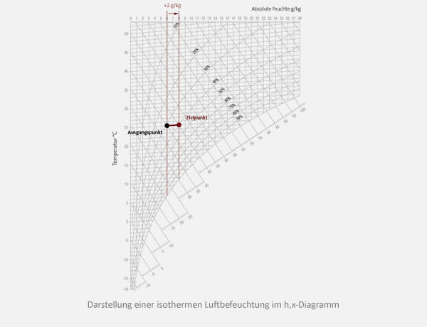Für eine isotherme Luftbefeuchtung muss zunächst Wasser auf 100°C erhitzt werden. Es erreicht dabei einen Wärmeinhalt von h=419 kJ/kg und einen Druck von 1,0133 bar. Bei diesem Punkt erfolgt der Wechsel des Aggregatszustandes, bei dem siedendes Wasser von 100°C in Dampf von 100°C umgewandelt wird. Dabei müssen je kg Wasser 2.258 kJ Energie hinzugeführt werden.