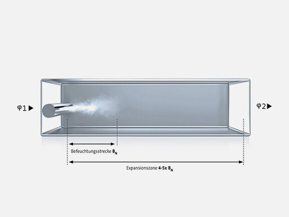Unter der Befeuchtungsstrecke versteht man die benötigte Distanz für die optimale Aufnahme des Dampfes in die Luft. Sie besteht im wesentlichen aus der Nebelzone und der Expansions- und Vermischungszone.