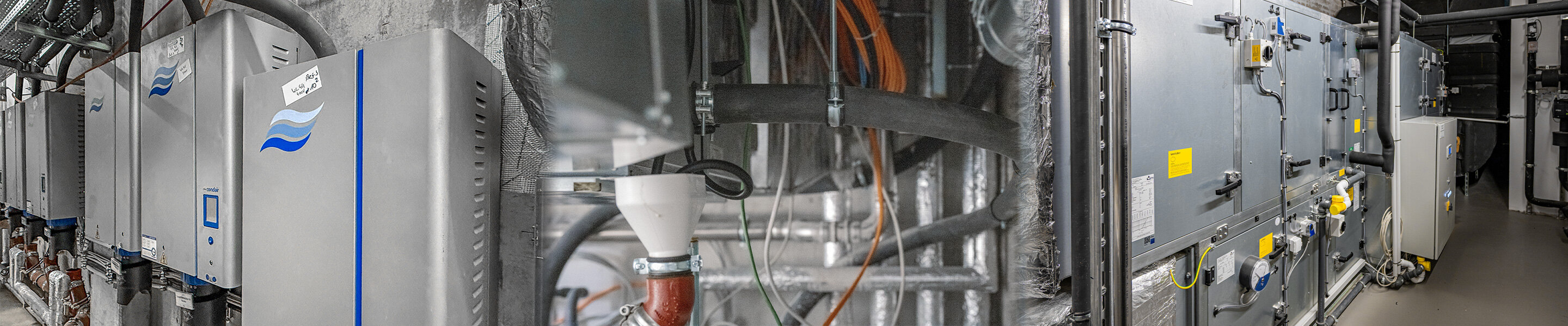 Das Trinkwasser für sämtliche Bereiche wird per chemischer Enthärtung mit Salz aufbereitet, um auf einen Härtegrad von ca. 6° zu kommen. Im zweiten Schritt erfolgt die Reduktion auf 0°. Dazu werden Geräte aus der Condair-Serie Soft eingesetzt. Für die Galerie reicht die Ausführung Soft 60 mit einer Kapazität von 56 m³xdH. Der Konzertsaal ist mit zwei Soft 120 ausgestattet, die jeweils 109 m³xdH erbringen. Anschließend wird das Wasser zu einer Umkehr-Osmoseanlage geleitet, die das hochwertige Permeat in einem atmosphärisch geschlossenen Druckspeicher aus Edelstahl bereitgestellt. Dieses hygienisch einwandfreie Wasser steht dann den Dampf-Luftbefeuchtern zur Verfügung. Durch die Verwendung hochwertiger Membranmodule wird die Dauerabgabe der benötigten Permeatleistung zuverlässig garantiert. Eine großvolumige Bevorratung des Befeuchtungswassers ist deshalb nicht erforderlich. Mit dieser Konfiguration wird stehendes Wasser vermieden und es werden die Hygieneansprüche garantiert, zudem führt es zu längeren Wartungsintervallen. Die Umkehrosmoseanlage Condair AX05 W stellt das Osmosewasser mit einer Permeatleistung von 50 l/h für die Galerie zur Verfügung. Das Modell AX 50 liefert 500 l/h für den Konzertsaal.