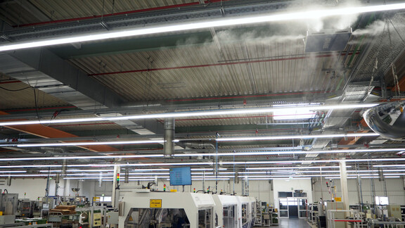 For quality assurance, the automotive supplier uses direct room air humidification in the production halls there. The installed high-pressure nozzle humidifiers of the TurboFog type spray a microfine mist when required, which is immediately absorbed by the room air and distributed evenly there.