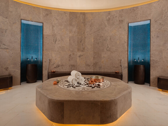 vaulted ceilings, and ambient lighting that fosters an atmos-phere of calm and serenity. The hammam, a steamy oasis inspired by ancient bathing traditions, provides a gentle and cleansing experience.