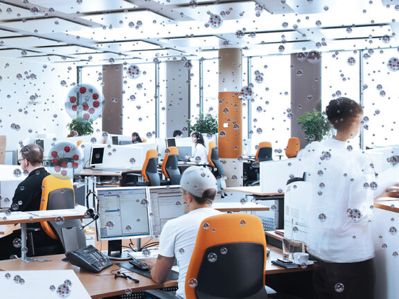 Die Lebensdauer von Viren und Bakterien hängt ebenfalls entscheidend von der Luftfeuchte ab: eine optimale Luftfeuchte von über 40% ist für ausgehustete Grippe- und Erkältungsviren innerhalb von Minuten tödlich. Unterhalb von 40% Luftfeuchte bleiben die Viren stundenlang infektionsfähig und können im ganzen Gebäude verteilt und eingeatmet werden. Experten sind sich einig, dass es in den nächsten Jahren eine noch rasante Entwicklung hin zu mehr Gesundheit am Arbeitsplatz geben muss: Für fast drei Viertel der Experten ist es sicher, dass bereits 2030 in nahezu jedem Büro eine optimale Luftfeuchte herrschen wird. Die Prävention vor den Folgen des „Dry Building Syndroms“ muss daher für Planer, Immobilienbesitzer, Mediziner, Gebäudenutzer und Unternehmer schon jetzt Herausforderung und Aufgabe sein.