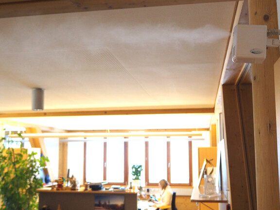 Die Direkt-Raumluftbefeuchter sind kaum sichtbar an Wand oder Decke angebracht und versprühen dort bei Bedarf einen mikrofeinen „Nebel“ aus hygienisch aufbereitetem Wasser. Die zusätzliche Luftfeuchte wird sofort von der Raumluft aufgenommen und verteilt sich gleichmäßig im Büro. Durch die schnelle Verdunstung wird zusätzlich ein vitalisierender Frischeeffekt der Raumluft erzeugt. Geregelt werden die Luftbefeuchter durch digitale Steuergeräte, die die Befeuchtung nur dann aktivieren, wenn der gewünschte Optimalwert unterschritten wird. Bei der Direkt-Raumluftbefeuchtung ist es nicht notwendig, ein komplettes Gebäude auszurüsten. Auch einzelne Etagen oder Büroflächen (z.B. Callcenter) können individuell und wirtschaftlich befeuchtet werden. Jede Luftbefeuchtungsanlage ist nur so gut, wie das dahinter stehende Wartungs- und Reinigungskonzept. Auch, wenn das verwendete Wasser klar und rein erscheint, können von den Wasserinhaltsstoffen Gefahren für die Gesundheit und die Betriebssicherheit ausgehen. Hygienestandards und Systeme mit automatisierten Wartungsintervallen schließen alle Risiken zuverlässig aus.
