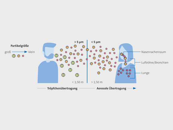 Virale Infektionen der Atemwege werden nahezu ausschließlich von Mensch zu Mensch in Innenräumen übertragen. Häufigster Ansteckungsweg ist die Luftübertragung im Nahbereich über Tröpfchen und im Fernbereich über Aerosole: Viren eines Infizierten werden von einem anderen Menschen eingeatmet und über die Schleimhäute der oberen Luftwege aufgenommen. Je nach Größe der Partikel spricht man von einer Tröpfchen- oder Aerosolübertragung. Aufgrund ihrer geringen Größe sind Aerosole besonders leicht. Virenbeladene Aerosole können sich in großen Räumen über eine erhebliche Zeitspanne in der Luft ausbreiten. Relevant für die Ausbreitung sind die Luftbewegungen und die Luftfeuchte, die direkten Einfluss auf Reichweite, Schwebefähigkeit und Infektiosität der Aerosole haben.