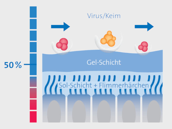 Der Mensch ist Angriffen von Viren und Bakterien nicht schutzlos ausgeliefert. Die Funktionsfähigkeit unseres Immunsystems entscheidet darüber, ob wir krank werden und wie schnell der Genesungsprozess ist. Im Atemtrakt schützen uns die Schleimhäute durch ihre Selbstreinigungsfunktion vor Infektionen. Die Schleimhäute besitzen auf ihrer Oberfläche feine Flimmerhärchen, die sich in einem dünnflüssigen Sekret (Sol-Schicht) frei bewegen. Darüber liegt eine klebrige Gel-Schicht, auf der ein Großteil der eingeatmeten Viren, Bakterien und Luftschadstoffe haften bleiben. Solange die Flimmerhärchen frei beweglich sind, transportieren sie den Schleim zusammen mit den Mikroorganismen in Richtung Kehlkopf, wo er verschluckt oder ausgehustet werden kann. Mit sinkender Luftfeuchtigkeit verliert jedoch der Abtransport der Krankheitserreger an Wirksamkeit.
